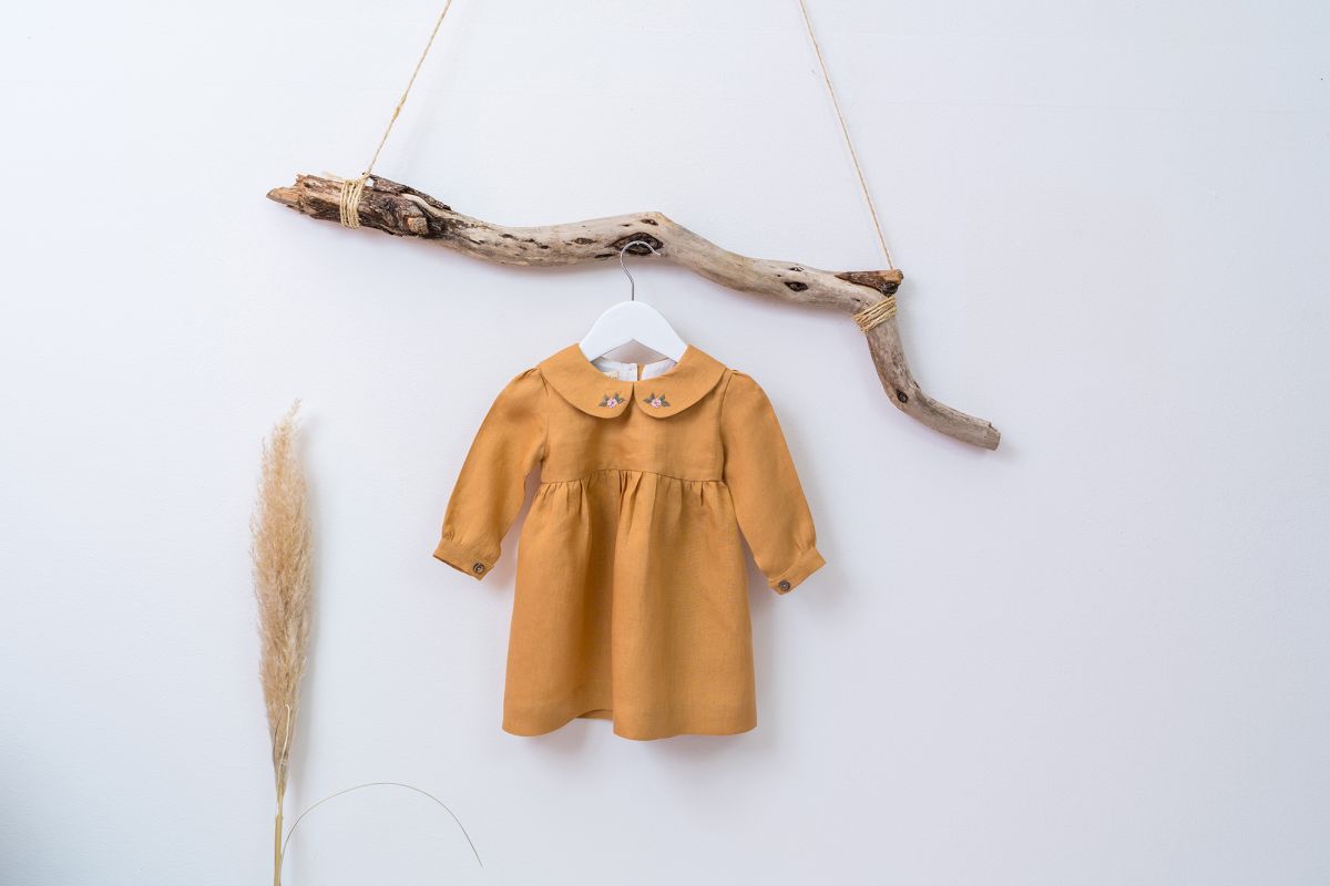 Das Langarm Kleid Astrid mit klassischem Bubi-Kragen ist bestickt mit schönen Rosen. Der einzigartige karamell-braune Farbton verleiht dem Kleid einen herbstlichen Charme. Das Kleid hat eine durchgehende Knopfleiste mit Knöpfen aus natürlicher Kokosnuss.