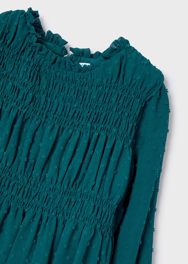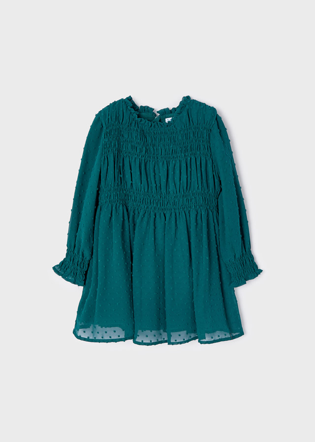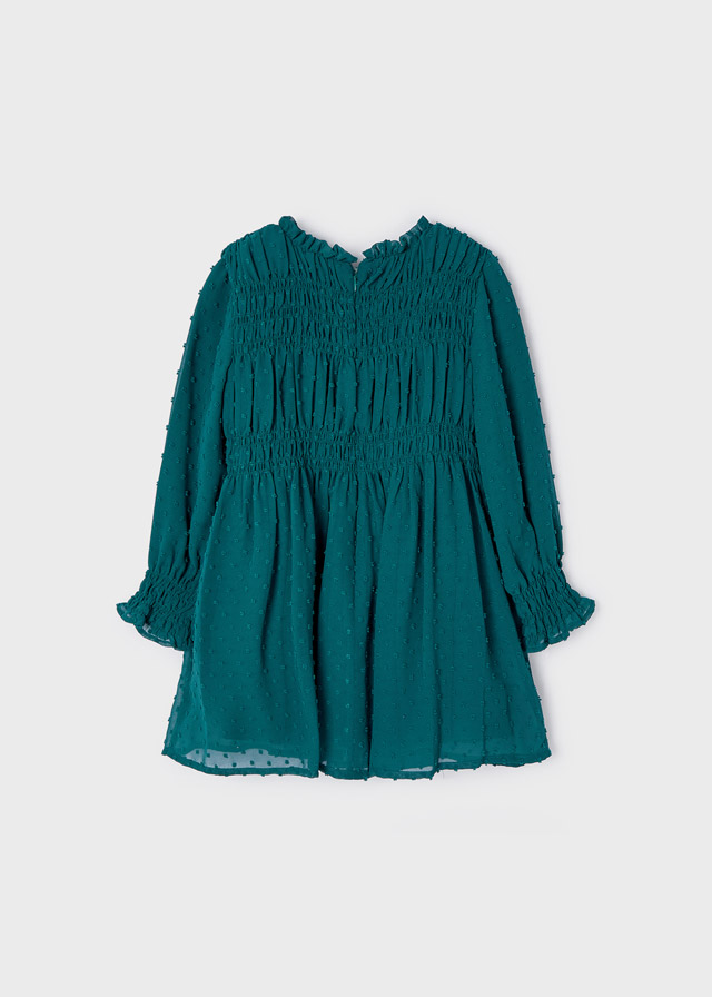 Das wunderschöne Langarmkleid von Mayoral mit zartem Muster ist ein Hingucker. Der runde Halsausschnitt sowie der Ärmelbund sind gerafft. Am Rücken befindet sich ein Reißverschluss.
