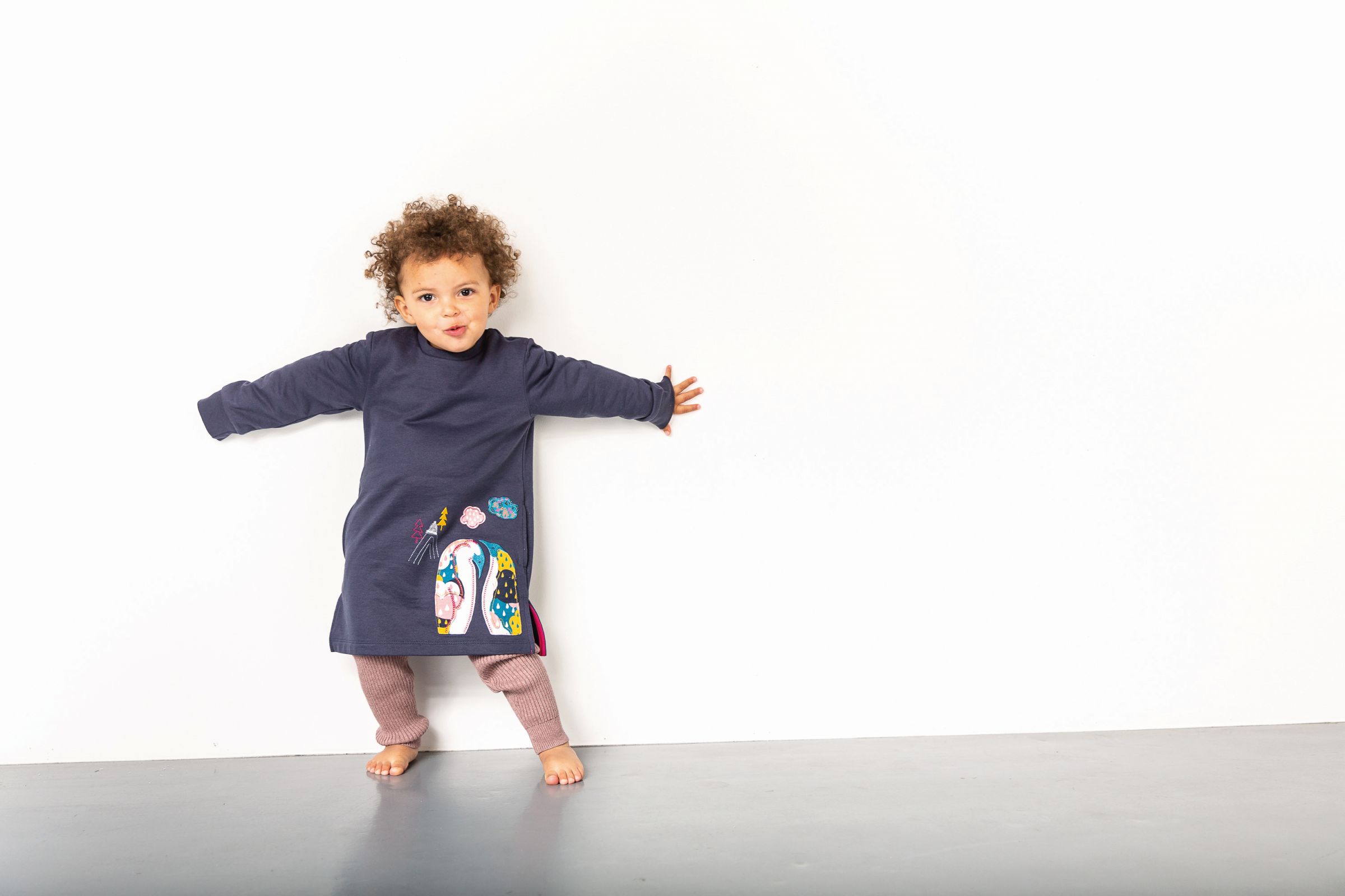 Das Schlupfkleid Lai in navy mit zwei aufgenähten Pinguinen am vorderen Saum ist aus hautfreundlicher Bio-Baumwolle und hat einen runden Halsausschnitt ohne Verschluss. An den langen Ärmeln befinden sich Bündchen. Das Kleid ist knielang und gerade geschnitten. Die Stoffqualität ist Sweat. Das Kleid kann mit Hosen oder Leggings aus unserem Sortiment kombiniert werden.