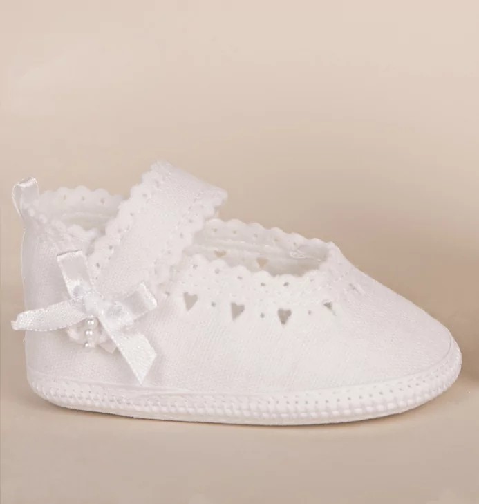 Die weißen Ballerina zeichnen sich durch klassisches Design aus. Im Material sind kleine Herzen gestanzt, die nicht nur schön anzusehen sind, sondern auch für eine bessere Luftzirkulation sorgen. Eine zarte Schleife sowie eine kleine Kunstperle sind ein schöner Hingucker. Der Klettverschluss erleichtert das An- und Ausziehen des Schuhs.